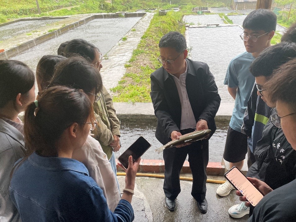 随后,一行人前往资源县中峰镇冷水鱼基地进行参观实习。基地负责人肖章息从冷水鱼基地基本情况、养殖专业特点与优势等方面进行了介绍。随后吴志强教授进行现场教学,向同学们介绍了虹鳟的分类特点以及在水产养殖中的前景,以鲜活的案例加深了同学们对冷水鱼养殖的认识,给同学们上了一堂生动的实践课。双方就澳门六合彩资料大全