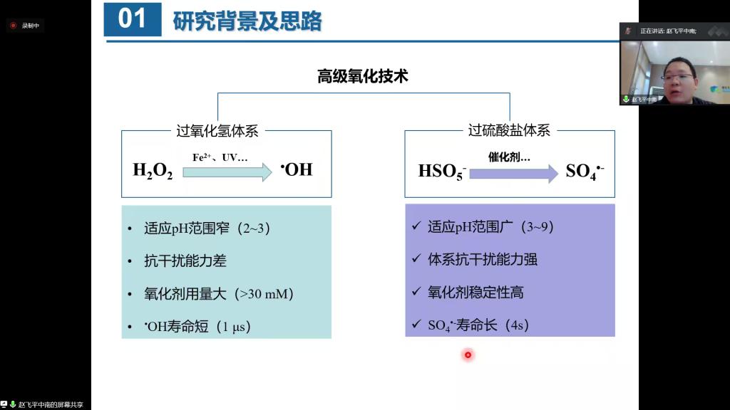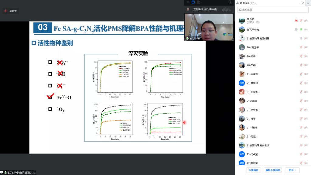 讲座中,赵飞平老师介绍了二维碳基铁单原子/过硫酸盐体系氧化多类污染物研究进展。深刻讲解了二维碳基材料载体选择、热解温度和相关表征,以及铁单原子活化PMS降解PBA性能与机理。通过本次线上讲座,加深了师生们了解单原子材料制备策略与应用的相关理论知识,且有助于师生们科研创新思维发展。