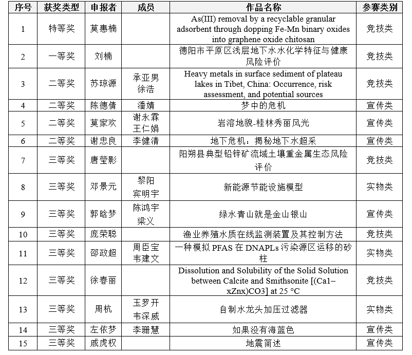 师生的广泛关注,共有50余份作品参加此次竞赛。竞赛由地下水科学与工程教研室的危嵩老师、赵雨晴老师和陈盟老师组成评审组,着重针对参赛作品的专业契合度、作品的科学性与创新性、以及作品的实际应用价值等进行评审。根据奖项设置,经由评审组老师们打分评选出特等奖1项、一等奖1项、二等奖4项和三等奖9项。