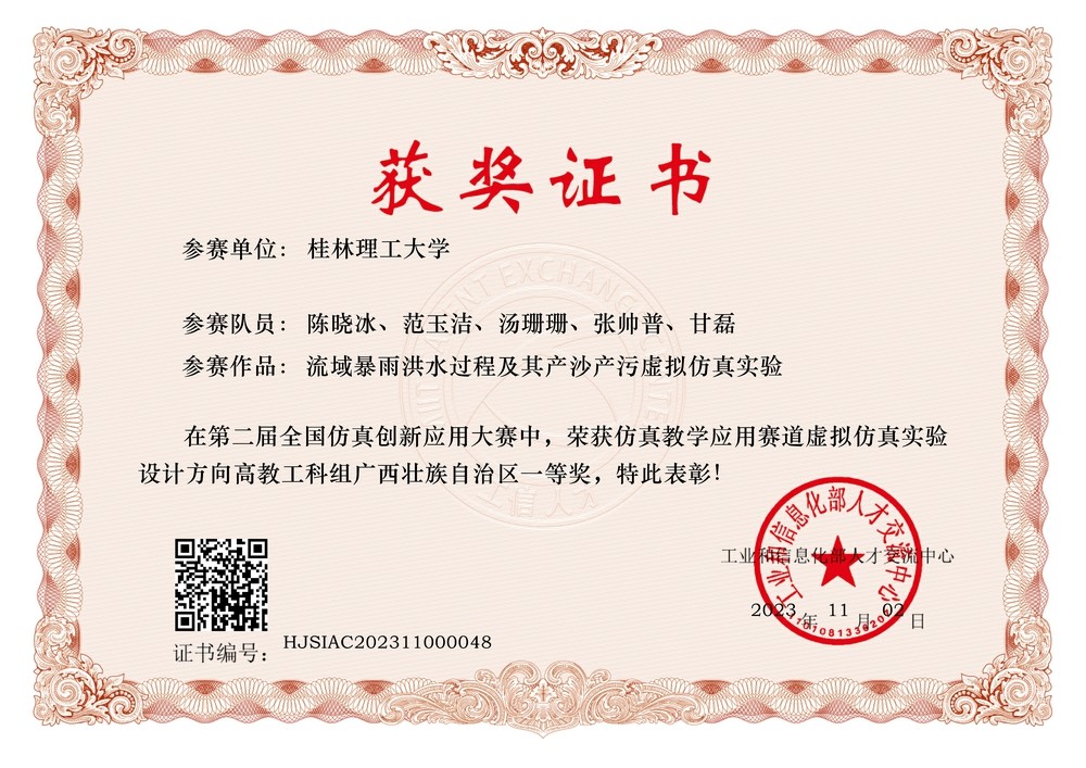 经过省级初赛,省级决赛和全国总决赛三个环节,澳门六合彩资料大全陈晓冰、范玉洁、汤珊珊、张帅普和甘磊教师的团队作品《流域暴雨洪水过程及其产沙产污虚拟仿真实验》获虚拟仿真实验设计方向(高教组)全国二等奖和区级一等奖。