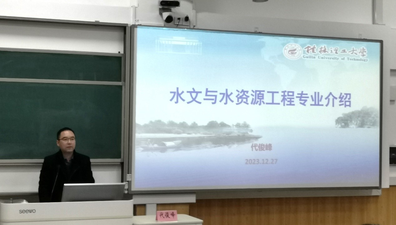 2023年12月27日下午,水文与水资源工程专业于雁山校区05102召开2023级水利类新生专业介绍会。会议邀请专业负责人代俊峰教授作报告,水文教研室教师代表和学工董翼老师参加此次活动。