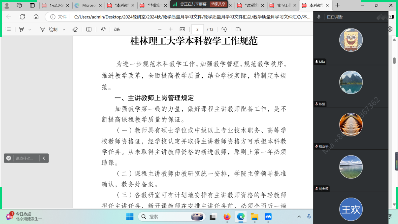 地下水科学与工程教研室开展了2024秋本科教学管理制度专题学习交流会议。会议内容涵盖了教学工作规范、课堂管理规定、考试管理规定、毕业实习和毕业设计工作规范等多个方面。就如何更好地执行和完善这些规范,教研室全体教师通过线上、线下进行多次深入讨论和交流,旨在全面提高日常教学工作的规范性和实效性。