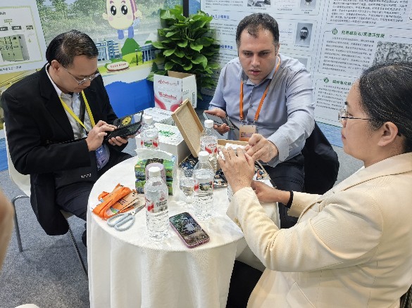 在水污染治理、资源循环利用等领域的创新成果。其中,“水处理功能材料”系列展板呈现植物遗态改性、复合活性、功能膜三大类创新材料,每款材料都通过电镜图、性能曲线和实物展示呈现完整研发链条。“水处理设备”系列展板则聚焦技术落地,展示涵盖城乡污水、工业废水、海水淡化等全场景的11类定制化装备,其中“外源厌氧氨氧化污水处理技术装置”因“零碳源添加、降本增效”成为咨询热点。