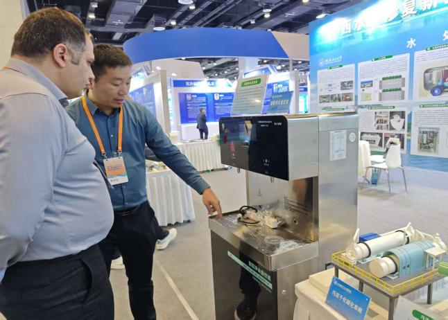 老师及志愿者们与中外嘉宾交流洽谈、讲解水处理功能材料与装备创新成果,互动热烈