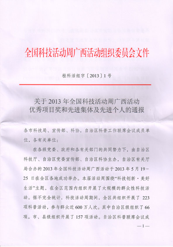 据悉,2013年全国科技活动周广西活动由自治区科技厅、自治区党委宣传部、自治区科协主办、自治区有关厅局合办,以“科技创新·美好生活”为主题,在全区范围内组织开展了大规模群众性科技活动,科技活动周期间,全区共组织开展了223项科普活动,参与群众近600万人次,其中自治区级组织了66项,市县级组织开展了157项。为鼓励在活动中表现突出的单位、个人和活动项目,共评选并授予“全国科技活动周广西活动优秀项目奖”42项。