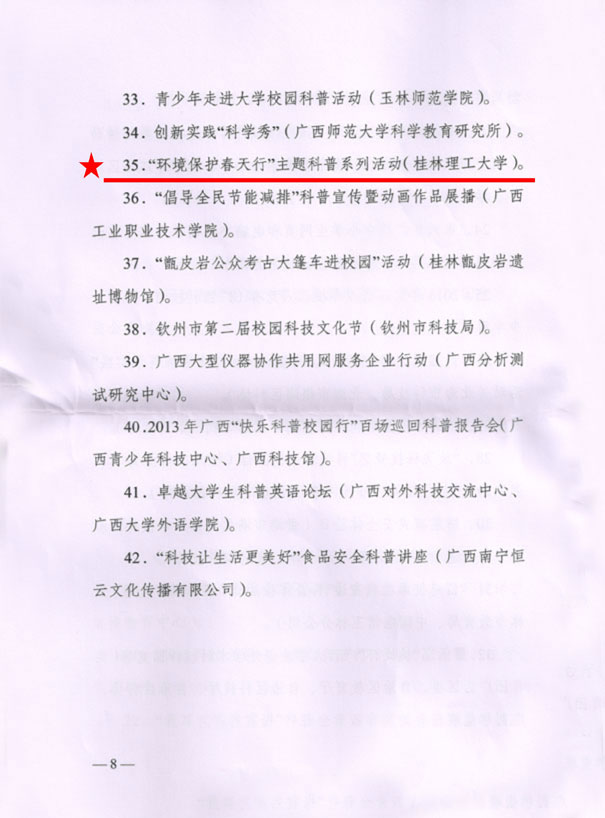 以精密的组织,切实的工作开展了丰富多彩的环保科普活动,获得良好的活动效果。活动得到评审单位的好评并获得“2013年度全国科技活动周广西活动优秀项目奖”。
