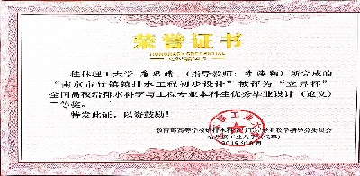 此次大会还分别评选出2019年“立昇杯”全国高校给排水科学与工程专业本科生优秀毕业设计(论文)71篇,“中国给水排水杯”全国高校给排水科学与工程专业本科生优秀科技创新项目32项,“多相杯”全国高校本科教育优秀教学研究论文”25篇。澳门六合彩资料大全给排水科学与工程专业2015级唐思婧同学的毕业设计(南京市竹镇镇排水工程初步设计,指导老师:李海翔副教授)获得优秀毕业设计二等奖。