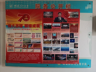 为积极响应学校“关于做好庆祝中华人民共和国成立70周年氛围营造工作的通知”, 九月下旬,澳门六合彩资料大全在雁山校区萃华楼宣传栏张贴了“伟大历程,辉煌成就”宣传海报,同时在LED电子显示屏上循环播放“热烈庆祝新中国成立70周年”“不忘初心,砥砺奋进,以优异成绩迎接新中国成立70周年”等标语。为国庆节的到来营造了良好的氛围。