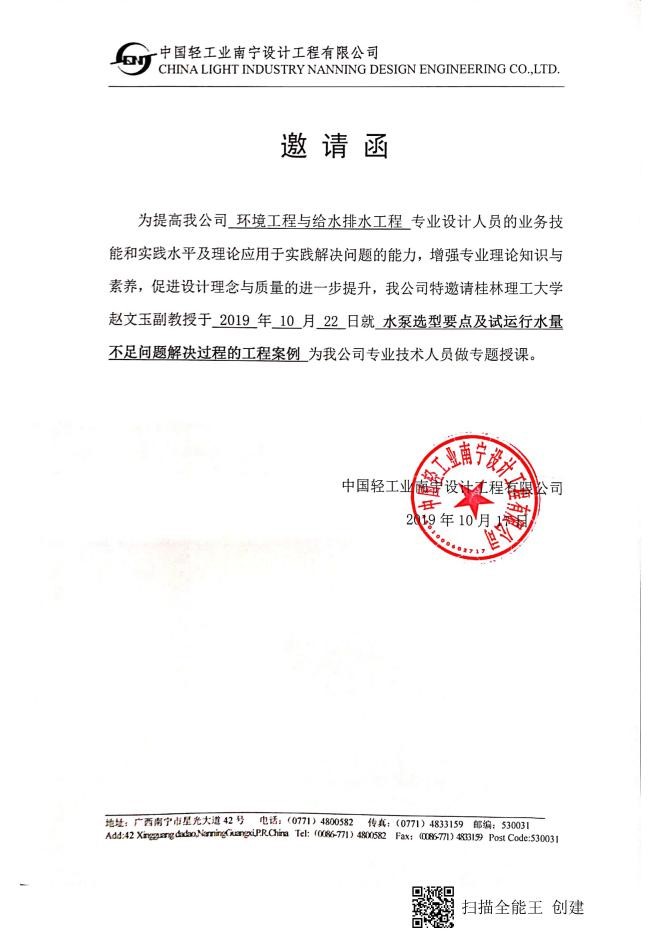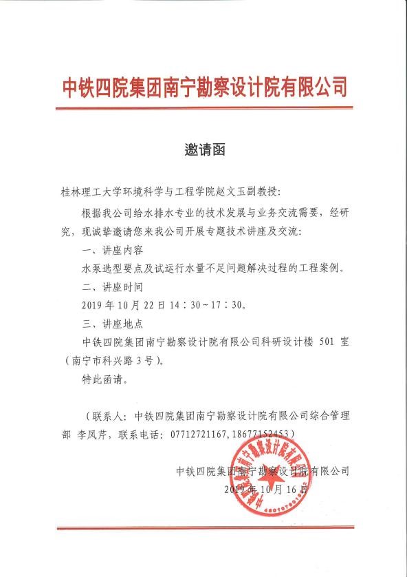 2019年10月22日,应中国轻工业南宁设计工程有限公司、中铁四院集团南宁勘察设计院有限公司的邀请,给排水教研室赵文玉副教授赴南宁在两家设计院司开展了《水泵选型要点及试运行水量不足案例解析》的专题讲座,对一些水泵应用典型案例进行了深入的探讨和交流,工程师们表示收获很大,赵文玉老师也丰富了水泵应用案例,也有助于丰富教学内容。