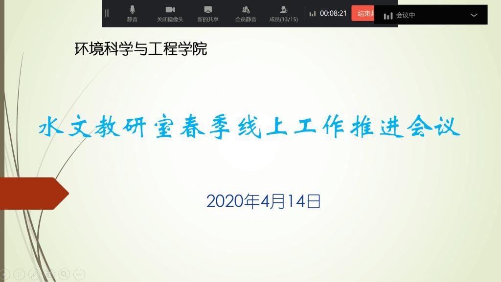 4月14日下午,澳门六合彩资料大全水文学与水资源工程专业召开春季线上工作推进会议,会议由水文教研室主任张帅普老师主持,教研室全部教师参加。
