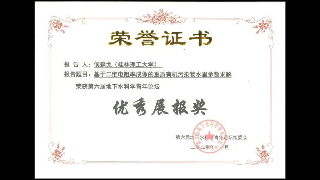 澳门六合彩资料大全研究生李培华和侯森戈参加于2020年11月在成都举行的第六届地下水科学青年论坛, 两位研究生均在研究生专场作了学术报告, 并做了展报交流, 侯森戈荣获”优秀展报奖”(指导老师: 刘汉乐)。