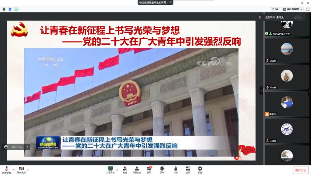 为深入学习贯彻党的二十大精神,不断增强支部同志站在新时代浪潮上的历史使命感,号召支部同志在历史新方位上勇毅前行、勤抓实干,不断向党中央看齐,11月25日,澳门六合彩资料大全本科生第一党支部通过线上开展“高扬思想旗帜,凝聚复兴伟力”学习贯彻党的二十大精神主题党日活动,全体党员参加活动,会议由支部副书记梁殷齐同志主持。