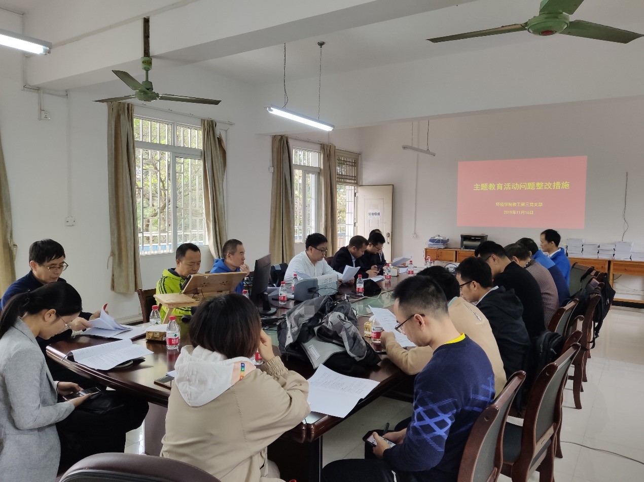 教工第三党支部在屏风校区12306召开支部党员大会,覃礼堂同志主持会议,环境工程教研室全体教师(包括支部党员)参加本次会议。参会人员针对主题教育活动中所检视的问题,研讨整改措施并形成整改方案。